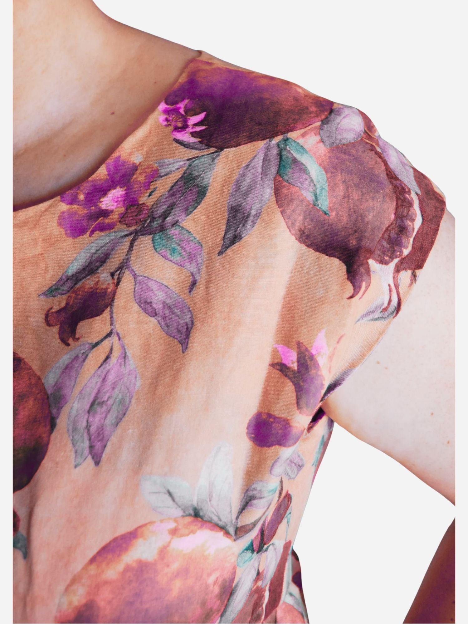 Wear this no-fuss comfy dress with heels and a necklace out to dinner, with a jacket and flats to a picnic or around the house on a hot day. Dress featuring cap-sleeves and double bodice can be customised in a number of ways through initial consultation, including adding T-shirt, elbow, 3/4 or full-length sleeves, adjusting bodice design (wrap, button down etc.), neckline or hemline shortened or lengthened. It can also be made in a woven or knit fabric to give versatility in style and comfort. The pomegranate dress shown is a cotton linen blend, while the first nations artworks designed by Pamela Napurrurla Walker is a viscose rayon.