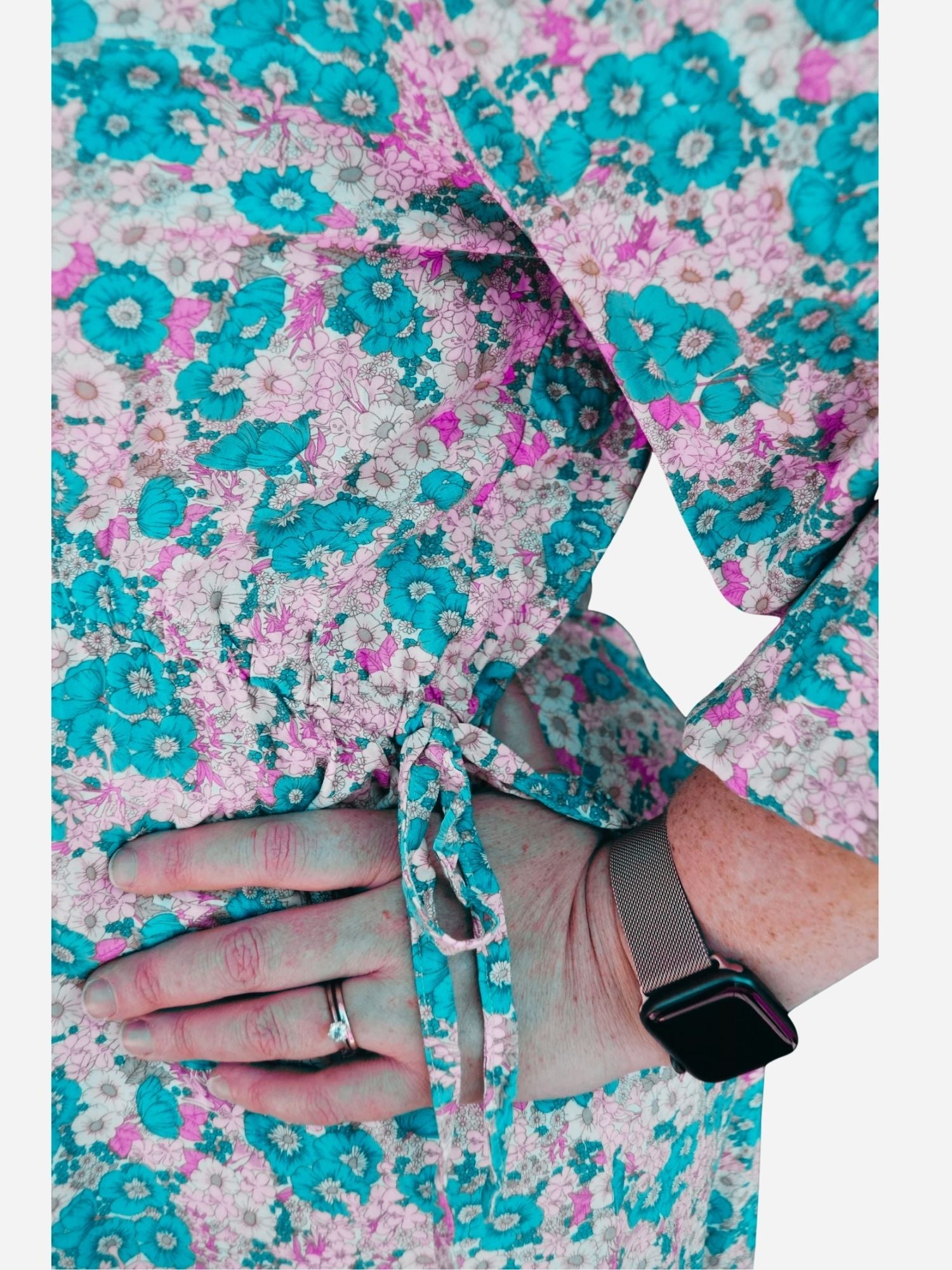 Wear this gorgeous dress to a picnic with strappy sandals, over your bathers to the beach, or on a fund night out with heals and a leather jacket. Featuring flowing 3/4 elasticated sleeves, mid-length dress with pockets, waist ties, and an arched waistline, customisations restricted only by your imagination